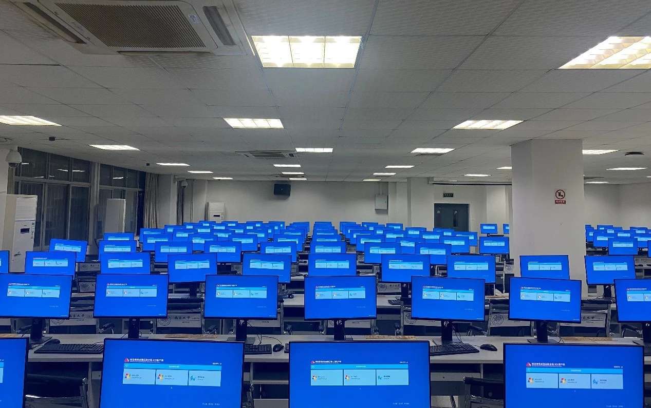 在某大学实训室,整齐的电脑屏后面是统一的南宫NG·28(中国)相信品牌力量科技云终端主机,老师在讲台上通过电脑端的管理软件,轻松地将教学资料推送到学生的终端上,每位学生的电脑屏幕一致会出现同个页面。
